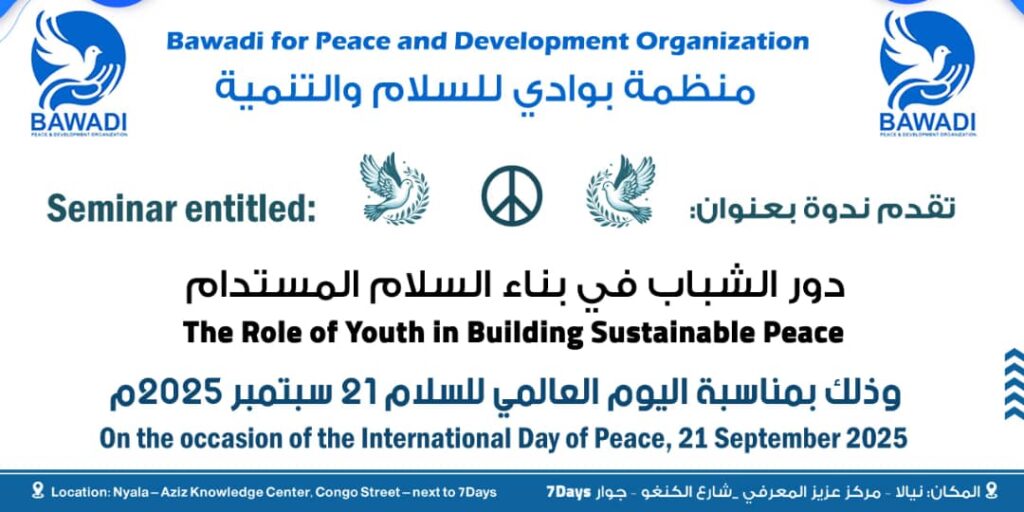 Nyala City in South Darfur State witnessed the convening of a symposium titled “The Role of Youth in Building Sustainable Peace”, initiated by Bawadi Organization for Peace and Development. The event came as part of the resumption of civil activities in the state, which had been suspended since the outbreak of war. The symposium highlighted the importance of youth in rebuilding a society exhausted by conflicts, where opportunities for education and employment were lost, negatively affecting the future of young generations and children.
