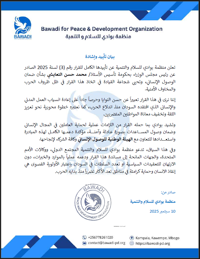 Bawadi for Peace and Development Organisation hereby declares its full support for Decision No. (3) of 2025 issued by the Prime Minister of the TASIS Government, Mr, Mohamed Hassan El-Taishi, on ensuring humanitarian access. We commend the courage of the leadership in taking this step under the difficult circumstances of war and prevailing security concerns.